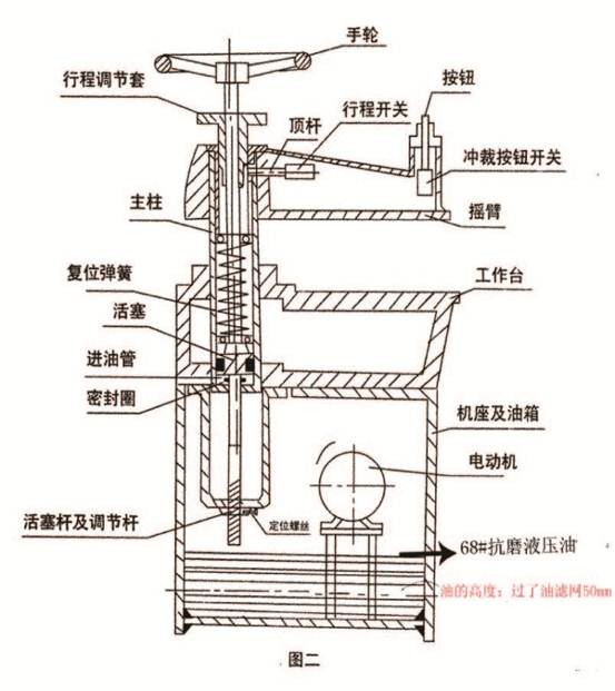 ﹙2﹚放上原料试冲载,如尚未冲断,则调整行程调节套﹙顺时针转动﹚,直到刚好冲断为止。或者转动手轮调节封闭高度﹙顺时针转动,直至刚好冲载断为止,切勿冲得太深,否则轻者损坏垫板,严重者则损坏机器﹚。以后转换刀模﹙不同高度的刀模﹚或材料﹙厚薄﹚时,仍按上述调整到合适为止。