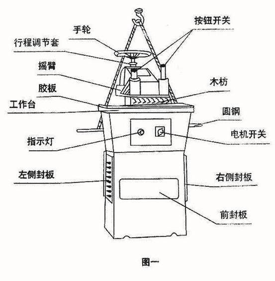 ﹙1﹚在工作台面上放上垫板﹙胶板﹚,在垫板上放上刀模﹙注意不要放在摇臂下面﹚刀模放在摇臂的左侧或右侧。将行程调节套调至距离摇臂顶端约20毫米处﹙逆时针转动行程最小,顺时针转动行程最大,参看图二﹚,在转动手轮,使刀模顶部至摇臂下面距离45毫米﹙逆时针转动摇臂上升,反之下降﹚。然后双手同时按下摇臂上的左右两个按钮,这时,摇臂向下运动,这是应注意观察摇臂下行终了时,是否与刀模顶部平衡,大致平衡后,才将刀模放在摇臂下面,再次按动两个按钮,摇臂向下运动,压到刀模顶部﹙仅仅接触﹚,待摇臂上升复位停止时,检查垫板是否留有冲载痕迹,以轻微冲载痕迹较为合适﹙即摇臂与刀模之间的距离调整封闭高度,应预先调高一些﹚。