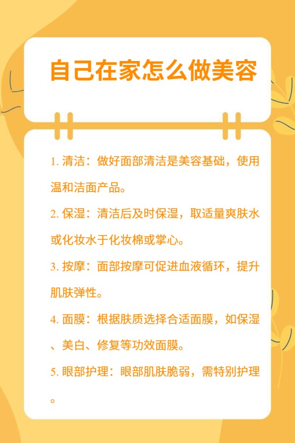 清洁、保湿、按摩、面膜、眼部护理等都是在家可进行的美容方式。
