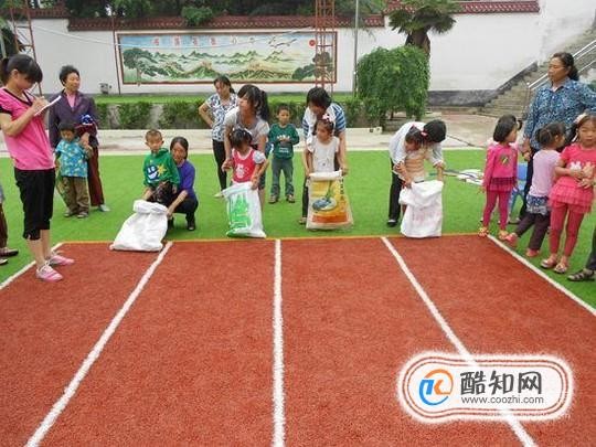 玩法:小朋友当小袋鼠套进老师准备的袋子了,袋鼠爸爸或袋鼠妈妈站在“小袋鼠”后面捏住袋子两角与孩子一起从起点跳到终点,看哪组家庭最快。(可适当在途中设置一些障碍物)