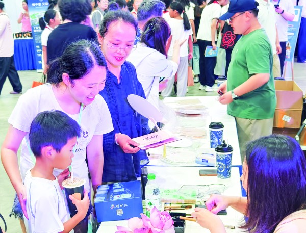在特色文创市集,钟书阁、新华书店、信条书店等松江本土特色书店携精美文创产品亮相,“家+书屋”非遗拓印书签、定制书包等手工体验以及朗读亭、趣味打卡、古书装订、丝网版画、书写扇面等互动体验活动也异彩纷呈(见上图),通过“文旅商体展”联动赋能,为乐于淘书收藏的读者带来多重福利。
