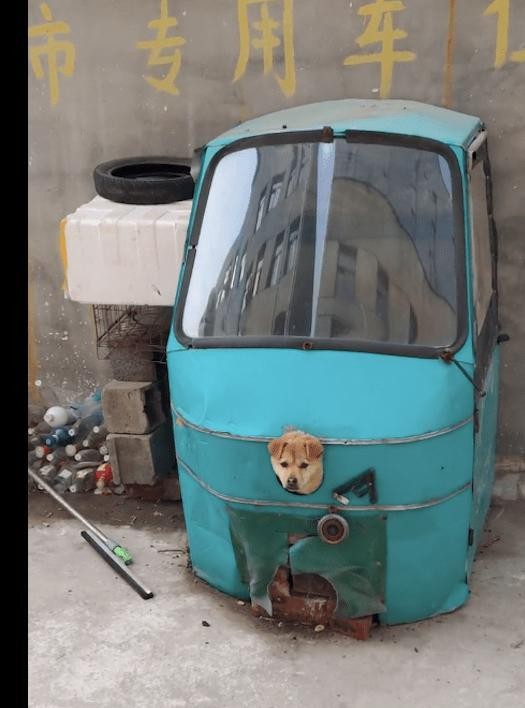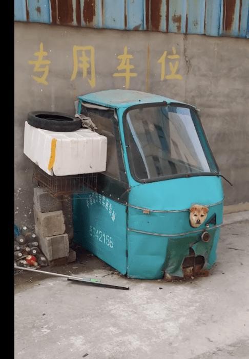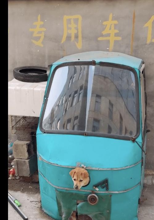 3月18日,山东临沂,一名网友路过某地,突然发现前面有一辆车。为什么会有狗头?走近一看,原来里面真的住着一只狗!后来才知道是附近超市老板养的狗帮老板看门!老板也是个机灵的人。他有一辆报废的车,就把车改装成了狗窝!