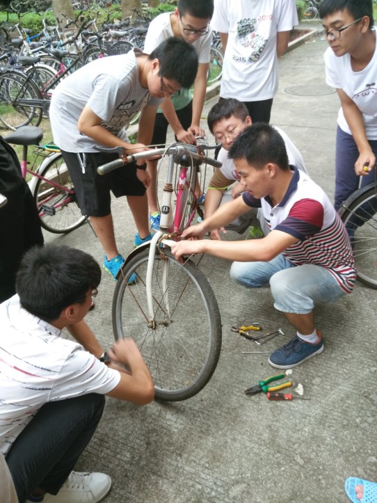 7月10日下午,福州大学校园公益自行车暑期社会实践“旧车改造”启动仪式在旗山校区生活一区六号楼架空层举行。机械学院“旧车改造”实践队团队负责人邓清康简要交代近几日的实践内容,并对团队成员进行修车培训,从自行车的结构讲到自行车各部分的工作原理,又细讲了常见问题的甄别和维修方案。培训不止停留在理论层面,接下来,邓清康挑选了一辆废车,现场演示修车的步骤。队员们都认真地听讲。