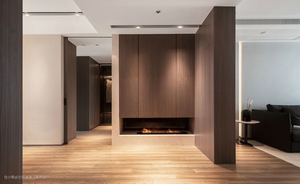 过道饰面大面积采用免漆木饰板,保持了空间的连贯性,变化万千的纹理细腻地演绎低调的浅奢情调。运用简洁利落的构成线条和色块进行组合延伸,由宽到窄,形成过道空间的节奏韵律感,这种韵律感让空间与空间对话,从而展开更为精彩的生活片段。