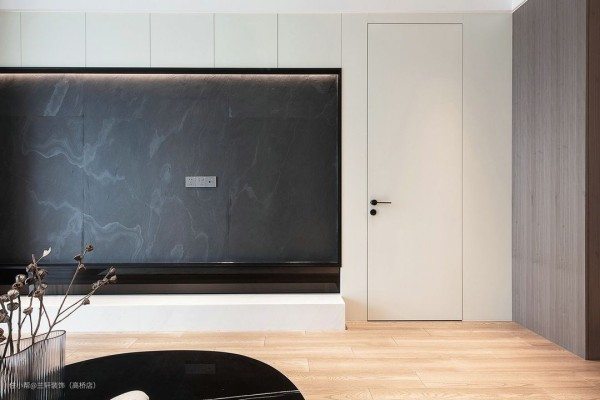 连贯的材质规划贯通这个空间中心,墨色纹理岩板电视背景墙作为主视觉延伸,搭配艺术流线型木地板,透露出空间个性,象征着对未来感的触碰,静与动的力量带动着空间节奏,奏响于此。