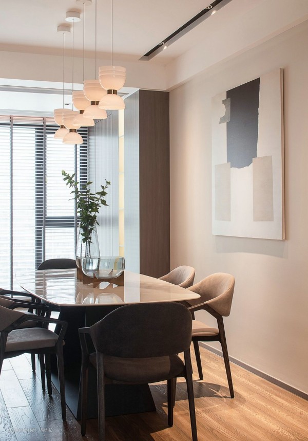 开放式用餐空间舒张通透,餐桌的温润色泽料与突显空间气质的手工漆墙体相辉映,头顶暖黄的点缀零星灯光,恰到好处地延伸空间动线,以点与线的层次递进,营造围桌而食的温馨氛围。