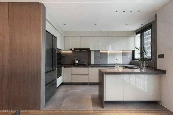 厨房采用了敞开式设计,高柜加低柜组合满足丰富的收纳,半岛式吧台的设置可以灵活使用。厨房与餐室之间没有切隔,光线和视野可以自由游移,加大既有空间的明亮感和通透性。