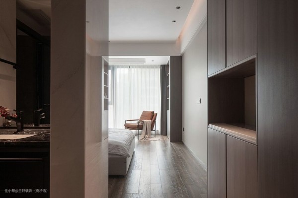 主卧全室延伸深色元素为空间轴心。背景墙板块式肌理融入冷静的空间态度,增添了细腻灵动的情调。不同的质感延展出不同情调的空间视觉,抹去冗杂,令人不自觉的释放出真实自我,有生活,有温度。
