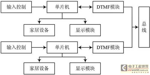智能家居控制系统的总体目标是通过采用计算机、网络、自动控制和集成技术建立一个由家庭到小区乃至整个城市的综合信息服务和管理系统。系统中照明及设备控制可以通过智能总线开关来控制。本系统主要采用交互式通信控制方式,分为主从机两大模块,当主机触发后,通过CPU将信号发送,进行编码后通过总线传输到从模块,进行解码后通过CPU触发响应模块。因为主机模块与从机模块完全相同,所以从机模块也可以进行相反操作控制主机模块实现交互式通信。系统主框图如图2所示,系统主从模块的程序流程图如图3所示。其中主机相当于网络的服务器,主要负责整个系统的协调工作。