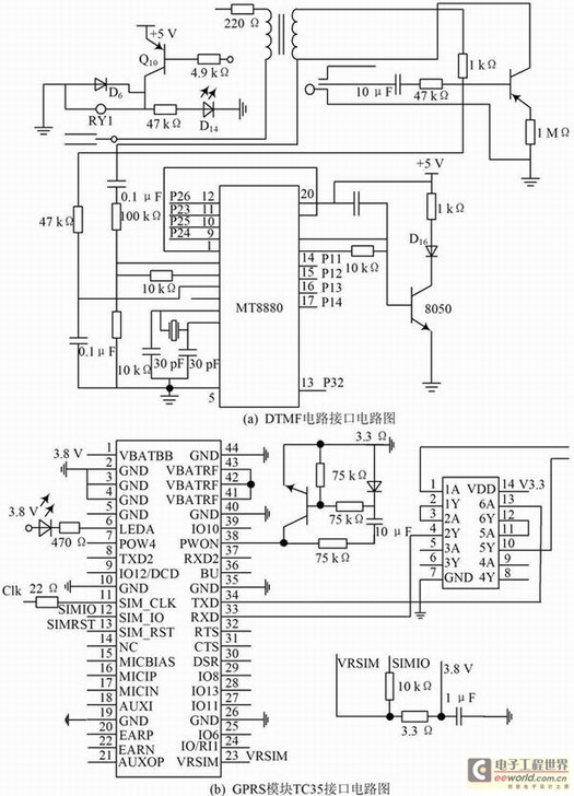 GPRS" title="GPRS">GPRS通信模块——TC35模块主要通过串口与单片机连接,实现单片机对TC35模块的控制,从而实现远程控制" title="远程控制">远程控制功能。电路如图5(b)所示。