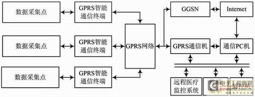 智能家居系统中,远程医疗应用应该说还没有引起广泛关注,但实际上它又是今后智能家居发展的一个方向之一。本系统提出的基于GPRS的远程医疗监控系统由中央控制器、GPRS通信模块、GPRS网络、Internet公共网络、数据服务器、医院局域网等组成。其框图如图6所示。