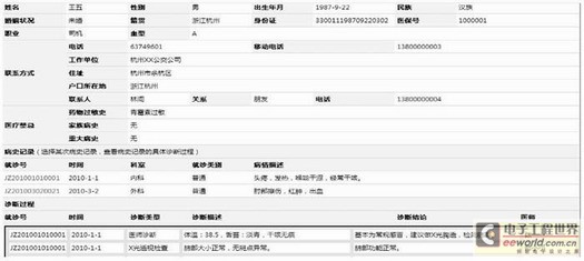 系统工作时,患者可随身携带的远程医疗智能终端首先实现对患者心电、血压、体温进行监测,当发现可疑病情时,通信模块对采集到人体现场参数进行加密、压缩处理后,以数据流形式通过串行方式(RS 232)连接到GPRS通信模块上,并与中国移动基站进行通信,基站SGSN再与网关支持节点GGSN进行通信,GGSN对分组资料进行相应的处理并把资料发送到Internet上,并且去寻找在Internet上的一个指定IP地址的监护中心,并接入后台数据库系统。这样,信息就开始在移动病人单元和远程移动监护医院工作站之间不断进行交流,所有的诊断数据和病人报告电子表格都会被传送到远程移动监护信息系统存档,远程移动监护信息系统存储数据以供将来研究、评估、资源规划所用。该GPRS远程医疗智能终端的硬件框图如图7所示。系统监护中心由监控平台和信息管理系统、电子地图、电子病历等组成,系统软件的框图如图8所示,其中电子病历系统中的病人详细病历界面如图9所示。
