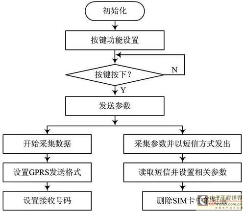 系统开机初始化,首先进入开机界面,然后进行参数设置。若直接选择确定则默认原设置,也可对默认设置进行重设。设置完成后,各传感器开始采集、处理参数,在液晶上显示各参数并通过GPRS将数据发送至用户手机,流程图如图10所示,数据短信收发流程如图11所示。