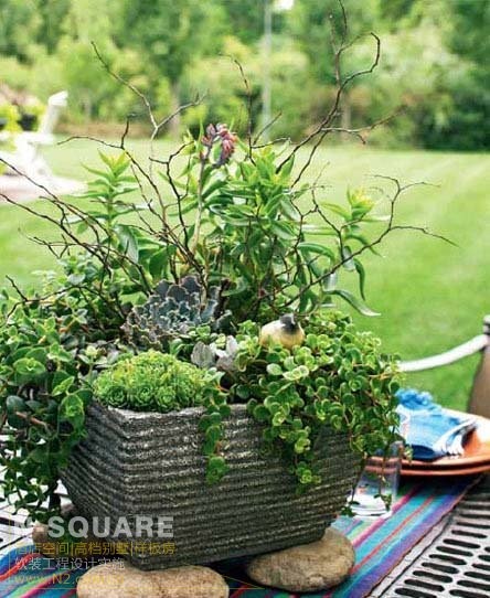 高低错落的植物组合是保证整体美观的前提,注意定期修剪枝叶,以便保持植物有一个美观的造型,也能起到促进植物生长的作用。这样迷你丛林很适合放在露台或则户外餐桌,一切的自然清新都与森味如此配合。质盆器里还配上白色卵石把绿色植物映衬得更加美观。