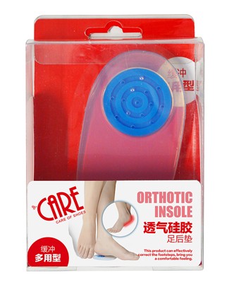 使用说明:根据脚码选择合适的足后垫,足骨刺引起的后跟中间特别疼痛时,蓝色圆片移去,凹面向上即可。硅胶材质有粘感,在鞋子里不移位,可长期使用。