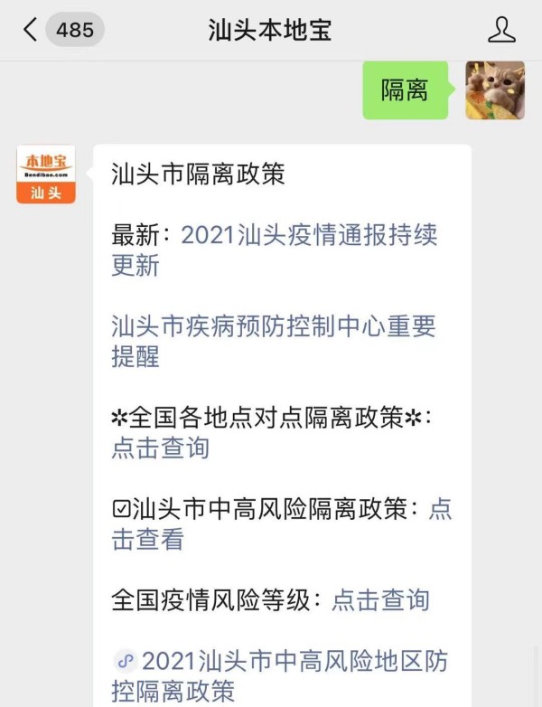 温馨提示:微信搜索公众号汕头本地宝,关注后在对话框回复【隔离】获取汕头中高风险隔离政策、全国隔离政策查询、汕头指定发热门诊/诊室、居家健康监测等。