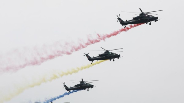 10月16日,在第七届中国天津国际直升机博览会开幕式上,陆军“风雷”飞行表演队进行飞行表演。10月16日,第七届中国天津国际直升机博览会在天津空港经济区开幕,陆军“风雷”飞行表演队为观众带来特技飞行表演。