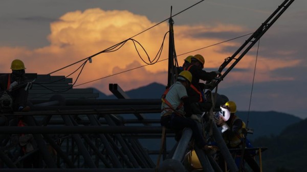 10月14日,建设者在衢丽铁路东西岩站站房候车厅钢网架上作业(无人机照片)。新华社记者 黄宗治 摄 10月14日,建设者在衢丽铁路东西岩站站房候车厅钢网架上进行焊接作业(无人机照片)。