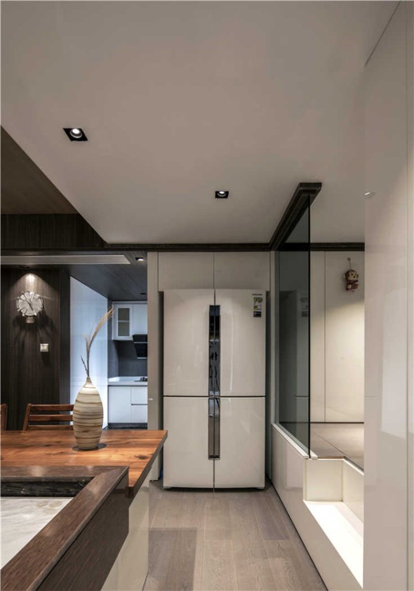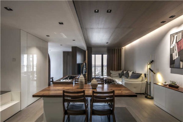 盥洗台与餐桌的结合放在客厅的中间,开放式的整体空间:厨房、客餐厅、书房以及盥洗台,都传达了一种全新的生活方式: