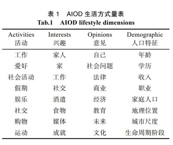 社会学领域另一个广泛使用的生活方式度量方法是1971年由Well与Tigert设计的AIO模型(活动activities、兴趣interests和意见opinions)[19]。后来,Plummer(1974:33-37)通过将人口特征(Demographic)引入AIO量表,拓展成为以活动、兴趣、意见和人口特征四个维度36个分支的AIOD生活方式量表(表1)。活动指:人们日常行为活动,人们如何度过他们的时间;兴趣指:人们对周围环境的关注与重视;意见指人们对自己和世界的看法;人口特征包括生命周期、收入、教育、生活等。