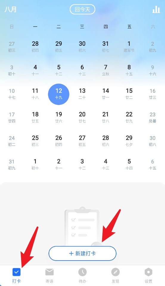 1、在“打卡”页面查看日历,点击“新建打卡”按钮可创建每日打卡计划,方便记录和养成习惯。