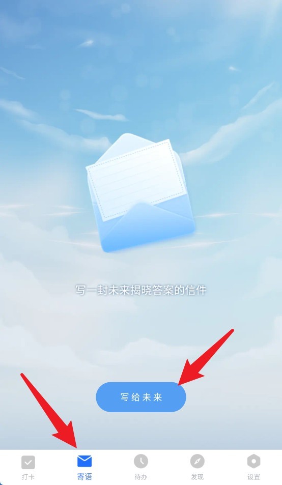 2、在“寄语”页面点击“写给未来”按钮,编写一封未来寄语信件,存下此刻心情与愿望。