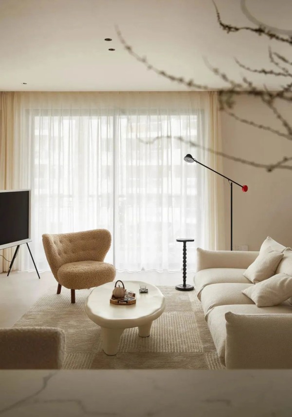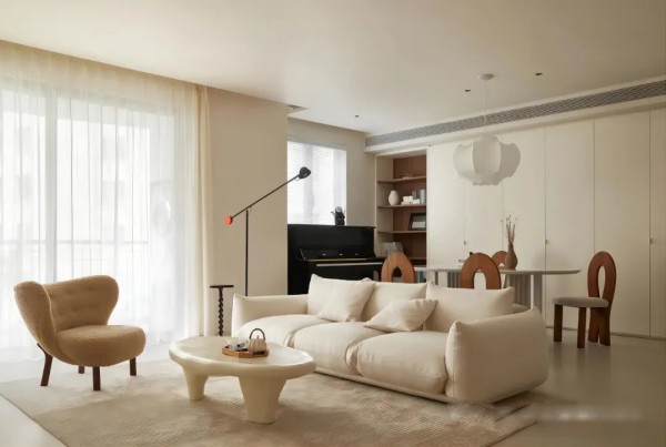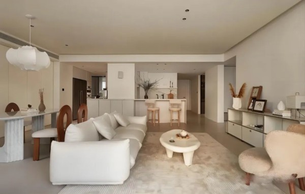 基于奶油风调性,设计师大面积留白的处理让整个空间干净简洁,奶油色系打底,精致优雅的家具营造出浪漫的居家氛围,给人一种岁月静好的惬意感。