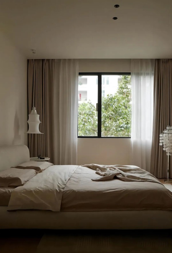 主卧设计清爽大气,奶油色涂料通刷,一进入卧室就让人不由自主的放松下来,竹节吊灯温馨有格调,布艺窗帘透着柔情光影,慵懒舒适氛围萦绕整个卧室。