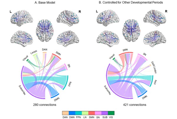 产前压力降低皮层下至认知网络的连接,儿童期压力削弱丘脑至边缘网络通路,青春期压力增强凸显网络至认知网络的连接,且与情绪调节能力下降及精神症状相关。压力时间窗对脑功能连接的影响具有特异性。