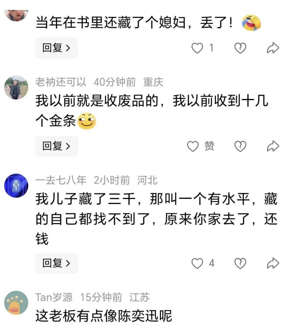 这段发布于社交平台的视频,掀起了一阵小小的波澜。画面中,男子蹲在堆满纸箱与旧物的角落,手指在书页间翻动的画面,意外触动了无数网友的集体记忆。评论区迅速分化为两派声音:一派艳羡于"废品回收竟能收获意外之财",另一派则懊恼自己学生时代藏在课本里的零花钱,最终都随着旧书处理而"付诸东流"。更有细心网友发现,视频中的男子眉眼间与歌手陈奕迅有几分神似,这个意外插曲为事件增添了几分娱乐色彩。