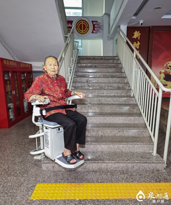 吴须阿婆乘坐无障碍斜挂式升降椅上楼 (林劲峰 摄)