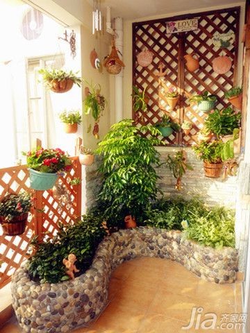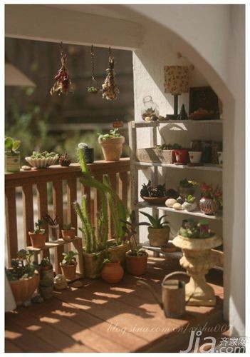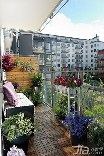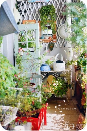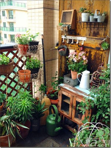 想用小盆的绿植来建造阳台花园,那多层的花盆架是不可或缺的,可以安置在阳台墙边,摆上各式各样的小花盆种上千奇百怪的小植物,等长到大得花架上放不下时,就搬下来随意摆在围栏边,开放的阳台和栅栏式的木围栏,能透过最充足的阳光。