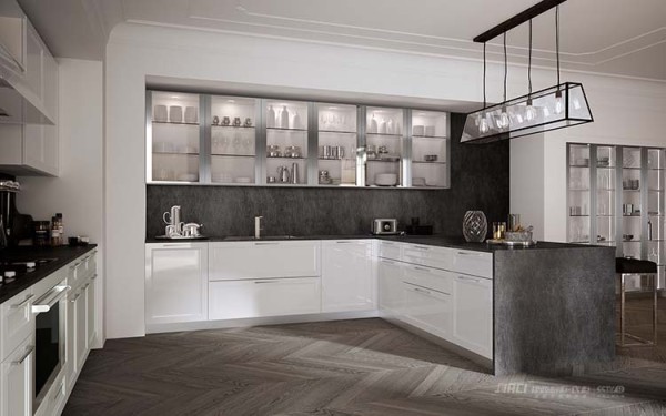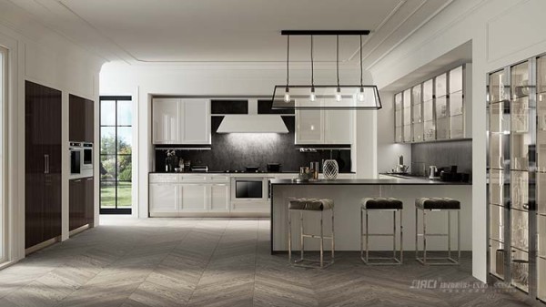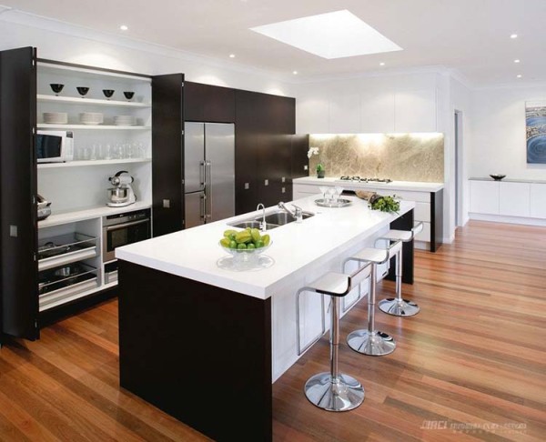 时尚现代的黑白橱柜设计,经典时尚,白色干净结洁,黑色深沉有魅力,两种色彩是永恒的时尚色彩搭配。