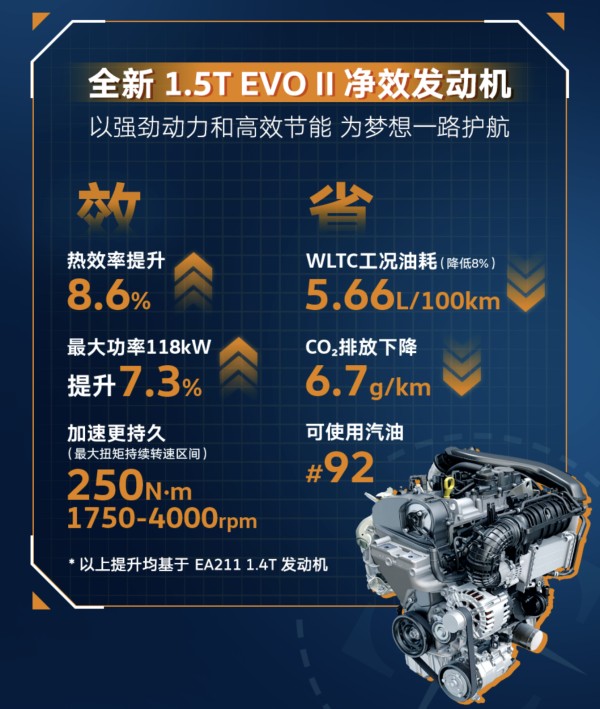 特别是在多数车企放弃开发高热效率发动机的背景下,上汽大众依旧在持续地升级内燃机的热效率,不断降低二氧化碳排放。作为上汽大众全新的“黄金动力”,上汽大众在1.5T EVO2发动机上应用了米勒循环、全新VTG可变截面涡轮增压器、350bar高压燃油喷射系统等一系列先进技术,让其最大功率提升7.3%,油耗下降8.6%,二氧化碳排放下降了6.7g/km。