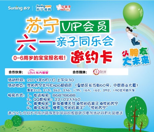 活动内容:6月1日,在苏宁北行Expo超级店室内一楼广场,举行由苏宁云商、苏宁易购、红孩子共同举办的《苏宁VIP 六一亲子同乐会》现场互动游戏活动,参加此次活动的宝宝都会有节日礼品一份哦!更多的精彩活动敬请关注近期的系列宣传!