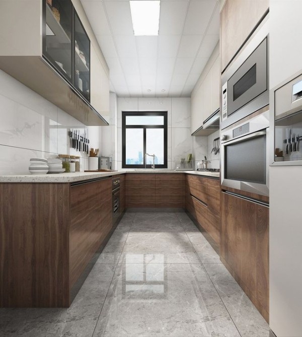 根据屋主的体型和弯腰程度,水槽、灶台、操作台的高度得量身打造。一般灶台略低,考虑到放锅好操作,而水槽、操作台略高,腰部较为合适。