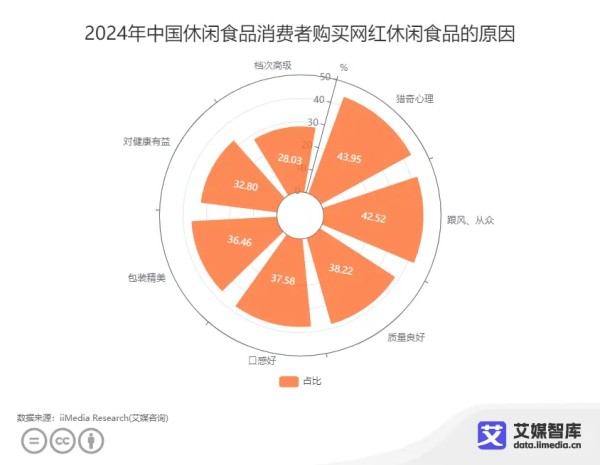 iiMedia Research(艾媒咨询)数据显示,在2024年中国休闲食品消费者购买网红休闲食品的原因中,43.95%消费者会选择猎奇心理,42.52%消费者会选择跟风、从众,38.22%消费者会选择质量良好,37.58%消费者会选择口感好,36.46%消费者会选择包装精美。