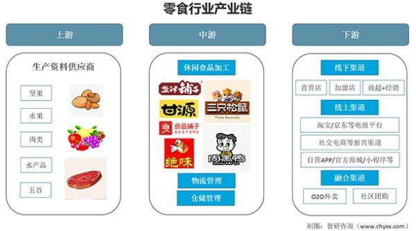 休闲食品产业链包括上游生产资料供应商,中游休闲食品加工、物流管理、仓储管理等,以及下游的销售渠道或终端消费者。