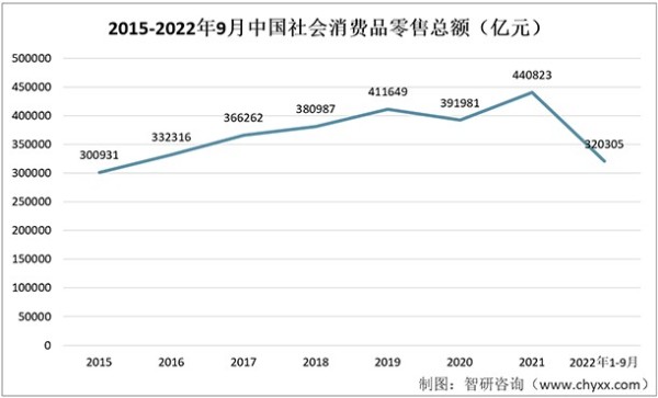 2015-2022年9月中国社会消费品零售总额(亿元)