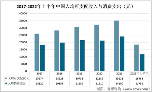 2017-2022年上半年中国人均可支配收入与消费支出(元)