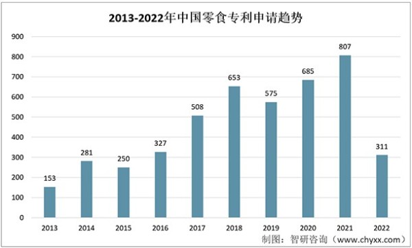 近年来,中国零食专利申请数量整体呈上升趋势,2021年,中国零食专利申请数量为807项,同比增长17.82%,2022年至今中国零食专利申请数量为311项。随着零食产业的不断革新及居民生活水平的提升,休闲零食行业呈现出注重健康、国潮兴起、儿童零食创新、功能化发展的趋势,零食产品更新速度加快,企业需要不断基于消费者需求进行创新。