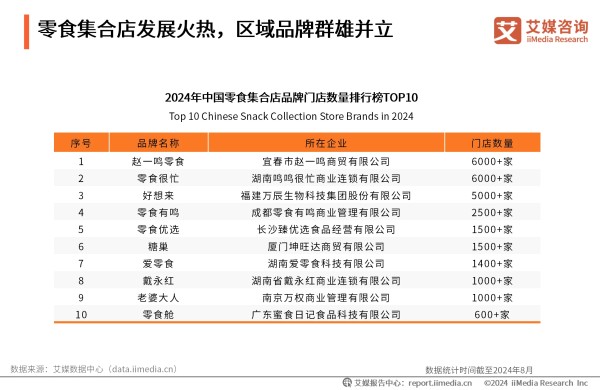 iiMedia Research(艾媒咨询)数据显示,中国零食集合店扩张迅猛,其中,鸣鸣很忙集团旗下赵一鸣零食、零食很忙全国门店数均已超过6000家。2024年赵一鸣零食和零食很忙合并成立鸣鸣很忙集团,合并后双品牌门店数量总和突破1万家。当前已经形成江西赵一鸣、湖南零食很忙和川渝贵零食有鸣等区域品牌群雄并立的格局。