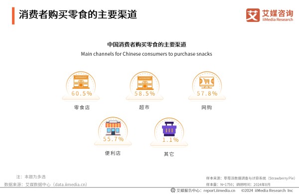 iiMedia Research(艾媒咨询)数据显示,线下购买渠道方面,60.5%的消费者选择在零食店选购零食,其次是选择到超市购买(58.5%);同时,线上购买渠道也深受消费者欢迎,57.8%的消费者选择网购零食。与其他购买渠道相比,零食店专注于零食销售,吸引了大量对零食有着较高要求的消费者。
