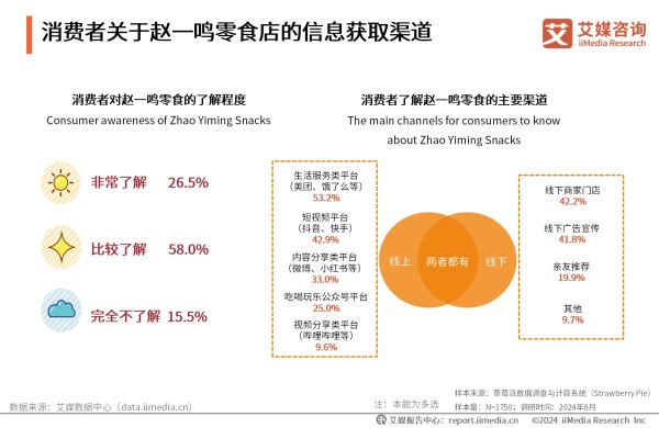 iiMedia Research(艾媒咨询)数据显示,84.5%的消费者对赵一鸣零食店有着不同程度的了解。其中,通过美团、饿了么等生活类平台了解到赵一鸣零食店的消费者占53.2%;在抖音、快手等短视频平台了解的消费者占42.9%;直接在线下零食集合店门店了解的消费者占42.2%。