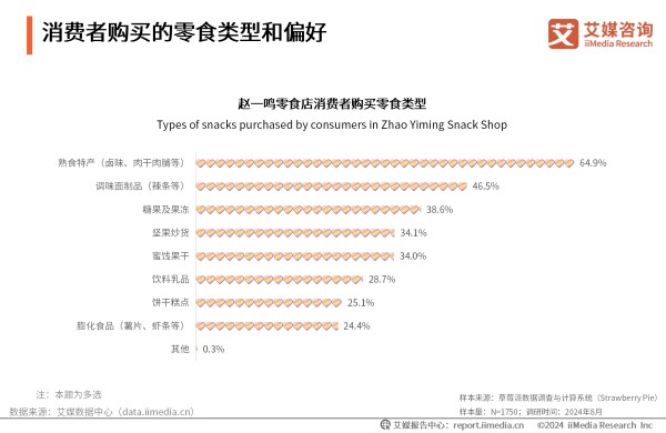iiMedia Research(艾媒咨询)调研数据显示,商品品质好(56.6%)和商品种类多(49.2%)是消费者选择赵一鸣零食的主要原因;赵一鸣零食店的消费者在购买零食时展现出多样化的偏好,熟食特产以64.9%的购买率位居榜首,其次是调味面制品(46.5%);此外,消费者指出赵一鸣零食店存在店内知名品牌零食较少(60.8%)和店面分布过于集中(59.4%)的问题。
