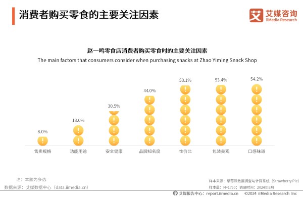 iiMedia Research(艾媒咨询)数据显示,赵一鸣零食店消费者购买零食时关注的前三个因素依次为:口感味道(54.2%)、包装美观(53.4%)以及性价比(53.1%)。在快节奏的现代生活中,零食往往扮演着满足即时口腹之欲的重要角色,消费者倾向于选择那些既满足口味偏好又价格合理的零食产品,同时消费者也注重产品的外观以获得更好的购物体验。