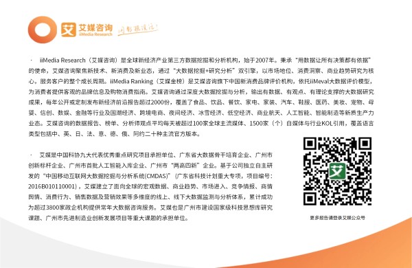 iiMedia Research(艾媒咨询)始于2007年,是全球领先的新经济产业第三方数据挖掘和分析机构,国家高新科技企业,拥有独立研发并具有自主知识产权的全球大数据监测与分析系统。秉承“用数据让所有决策都有依据”的使命,艾媒聚焦新技术、新消费及新业态,通过“大数据挖掘+研究分析”双引擎,以商业趋势、消费洞察、市场地位三大产品为核心,服务客户的整个成长周期,为客户业绩增长导航。iiMedia Ranking(艾媒金榜)是艾媒咨询旗下全球新消费品牌评价机构,依托iiMeval大数据评价模型,为消费者提供客观的品牌信息及购物消费指南。艾媒咨询依托深度大数据挖掘与分析能力,持续输出兼具数据支撑、观点洞察与理论深度的高质量研究成果。通过打造“数据+策略”的双重价值体系,艾媒咨询每年为客户提供公开及定制化新经济前沿报告超2000份,覆盖食品、饮品、餐饮、家电、家装、汽车、鞋服、医药、美妆、宠物、母婴、信创、数娱、AI、科技、金融等传统核心行业,以及国潮经济、跨境电商、夜间经济、冰雪经济、低空经济、商业航天、人工智能、智能制造等新质生产力相关领域及新业态重点赛道。其中,定制化报告服务精准对接客户个性化需求,从市场趋势研判、竞争格局分析到增长路径规划,为企业在战略决策、产品创新、市场拓展、品牌背书等关键环节提供科学依据,洞见增长新坐标。艾媒咨询的数据报告、榜单、分析师观点累计被全球主流媒体、期刊、论文及行业研报、上市企业财报等引用超过5000万次,覆盖中、英、日、法、意、德、俄、阿约二十种主流官方语言,具有强大影响力。