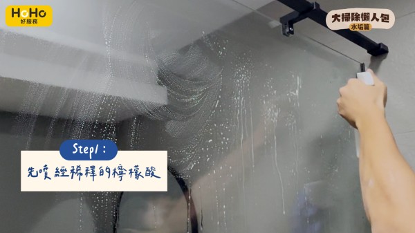 水垢是水中礦物質殘留在表面形成的,特別在淋浴門和水龍頭附近最為明顯。使用檸檬酸能有效去除水垢。步驟很簡單: