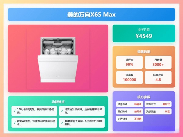 还有一点,洗碗机的清洁能力也很重要,要关注它的喷淋系统、水温以及是否有针对重油污的特殊洗涤程序。像东芝Z5Pro的三旋智驱喷淋和美的万向X6S Max的万向喷淋臂,都能实现360°无死角清洁,让你的餐具焕然一新。