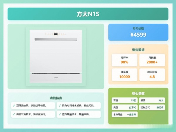在挑选白色洗碗机的时候,首先要考虑的是你家的厨房空间和人口数量。如果厨房空间比较小,那可以选择台式或者嵌入式的洗碗机,这样既能节省空间,又能满足日常的洗碗需求。要是家里人口比较多,或者经常聚餐,那大容量的洗碗机肯定更适合你,像方太N1S、老板F80D或者海尔W5000SMax这种能洗13套甚至18套餐具的型号,绝对能让你告别堆积如山的脏碗筷。